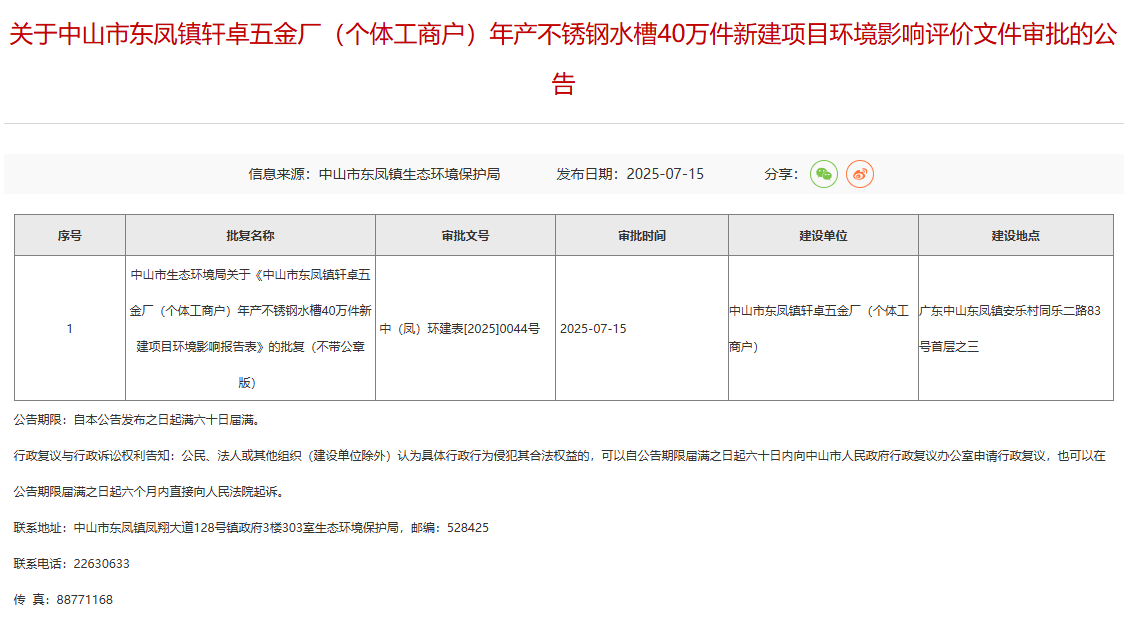 2025年7月15日,中山市東鳳鎮(zhèn)生態(tài)環(huán)境保護(hù)局就中山市東鳳鎮(zhèn)軒卓五金廠(個(gè)體工商戶(hù))年產(chǎn)不銹鋼水槽40萬(wàn)件新建項(xiàng)目環(huán)境影響評(píng)價(jià)文件作出審批意見(jiàn)并對(duì)外進(jìn)行公告,公告期限:自本公告發(fā)布之日起滿(mǎn)六十日屆滿(mǎn)。