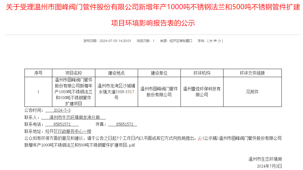 7月3日,溫州市生態(tài)環(huán)境局龍灣分局受理溫州市圖峰閥門管件股份有限公司新增年產(chǎn)1000噸不銹鋼法蘭和500噸不銹鋼管件擴建項目環(huán)境影響報告表并對外進行公示,公示期:7個工作日。