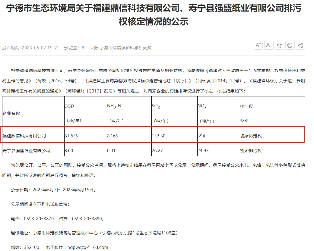 6月7日,寧德市生態(tài)環(huán)境局就福建鼎信科技有限公司排污權(quán)核定情況對外進行公示, 公示日期:2023年6月7日-2023年6月15日。