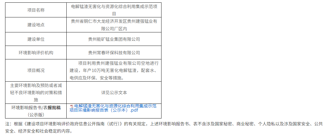根據公示內容:該項目利用貴州建強錳業有限公司空地進行建設,年產10萬噸無害化電解錳渣,配套水、電供應及環保、安全等措施。