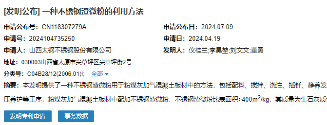 2024年7月9日,山西太鋼不銹鋼股份有限公司成功申請一項(xiàng)名為“一種不銹鋼渣微粉的利用方法”專利,申請公布號為CN118307279A,申請日期為2024年4月19日。