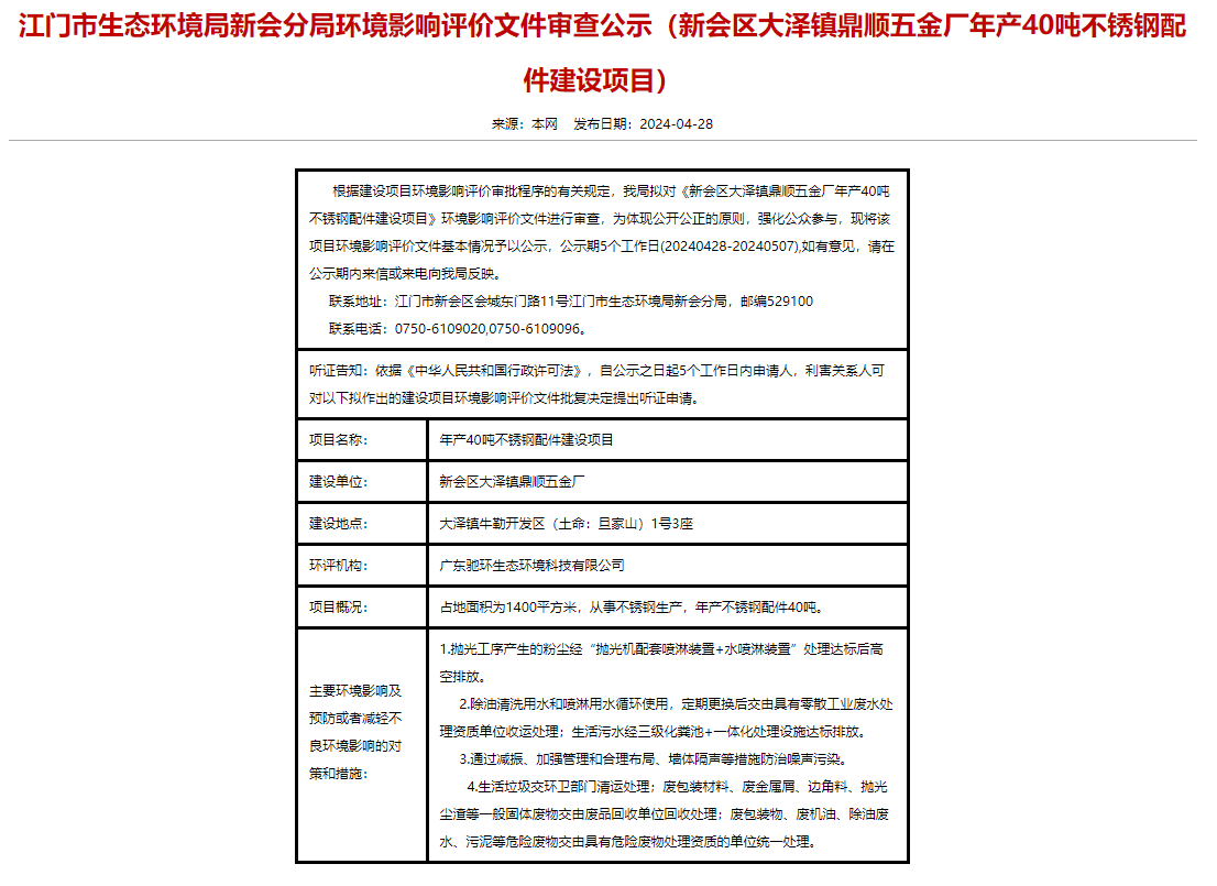 4月28日,江門市生態(tài)環(huán)境局新會分局就新會區(qū)大澤鎮(zhèn)鼎順五金廠年產(chǎn)40噸不銹鋼配件建設項目環(huán)境影響評價文件進行審查公示,公示期5個工作日(20240428-20240507)。