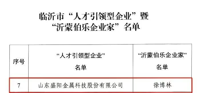 其中,山東盛陽金屬科技被評選為“人才引領型企業(yè)”,集團總裁徐博林被授予“沂蒙伯樂企業(yè)家”榮譽稱號。